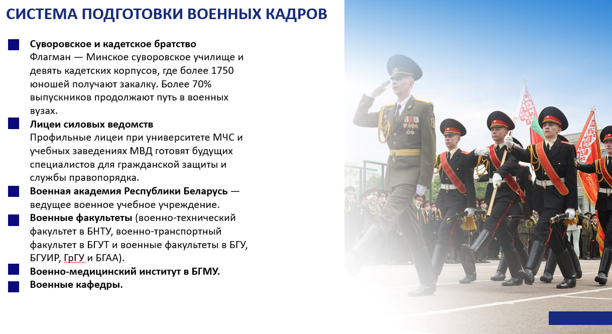 В Беларуси создана самодостаточная система подготовки военных кадров (от лейтенанта до генерала), интегрированная в структуру государственного образования. Она пользуется значительным авторитетом среди государств ближнего и дальнего зарубежья, о чем свидетельствует обучение в белорусских военных учебных заведениях военнослужащих дружественных государств.