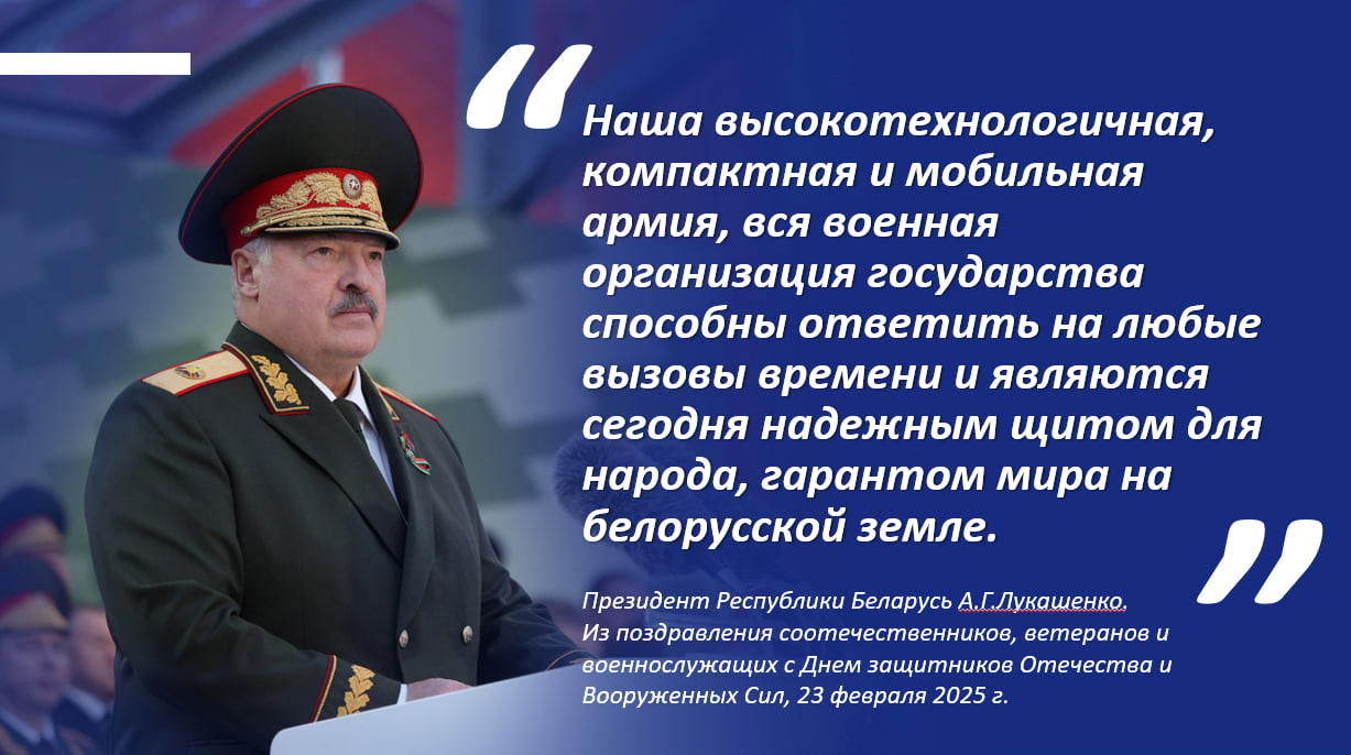 Поздравляя соотечественников, ветеранов и военнослужащих с Днем защитников Отечества и Вооруженных Сил в 2025 году, Президент Республики Беларусь А.Г.Лукашенко особо отметил: «Наша высокотехнологичная, компактная и мобильная армия, вся военная организация государства способны ответить на любые вызовы времени и являются сегодня надежным щитом для народа, гарантом мира на белорусской земле».