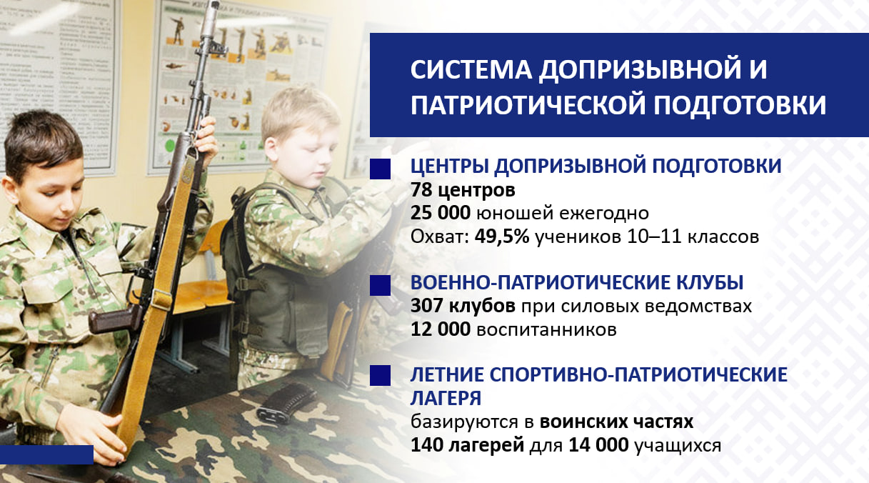 На сегодняшний день в стране действует 78 центров допризывной подготовки, которые посещают около 25 тыс. юношей (49,5% от всех юношей 10–11 классов).
